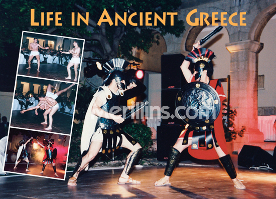 ![]() Life in Ancient GreeceΣτην συγκεκριμένη παραγωγή παρουσιάζονται σε μικρές σφήνες στιγμιότυπα από την ζωή των Αρχαίων Ελλήνων και την σχέση τους με τον αθλητισμό και τα όπλα. Στο πρώτο θέμα παρουσιάζονται 2 Αρχαίοι Έλληνες πολεμιστές με πλήρη εξάρτηση (περικεφαλαία, πανοπλία, ασπίδα & ξίφος) σε μια 10λεπτη χορογραφημένη ξιφασκία εποχής. Στο δεύτερο θέμα παρουσιάζονται 2 Αθλητές οι οποίοι θα αποδώσουν πιστά την αρχαία πολεμική τέχνη «ΠΑΓΚΡΑΤΙΟ» σε μια 10λεπτη παρουσίαση. Και οι δύο θεματογραφίες δείχνουν απόλυτα το Αρχαίο Ελληνικό πνεύμα. |