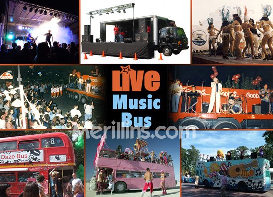 ![]() Live Music BusΖωντανή μουσική με κίνηση πάνω σε τέσσερις τροχούς σε ειδικά διασκευασμένη άτρακτο φορτηγού. Γεννήτριες, ήχος & φώτα καθώς και πλήρες μουσικό & χορευτικό σχήμα δίνουν μια διαφορετική νότα στην πόλη. |