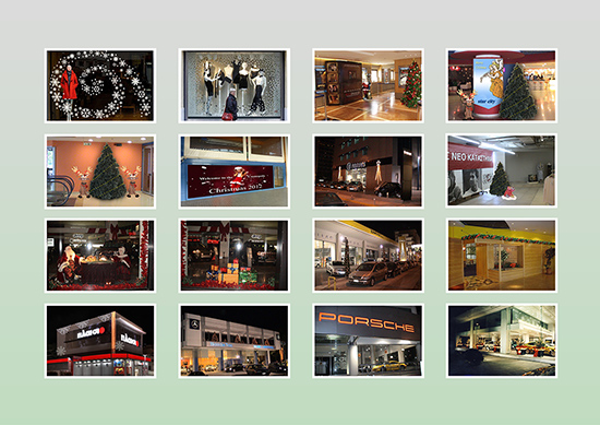 Ακόμα μία από τις σημαντικές υπηρεσίες που προσφέρει η εταιρεία μας στην Χριστουγεννιάτικη διακόσμηση είναι η εκτύπωση απεριόριστων μέτρων υψηλής ανάλυσης σε βινύλιο σε χαρτί και αυτοκόλλητο τζαμιών και δαπέδου δίνοντας μια άλλη εικόνα σε υψηλά κτίρια ή προσόψεις και εισόδους εμπορικών κέντρων και καταστημάτων. Επίσης η εταιρεία μας κατασκευάζει φωτεινές πινακίδες στα σχήματα που επιθυμείτε καθώς και Neon και άλλες κατασκευαστικές φωτεινές πηγές. Θέλετε κάτι δυνατό, εντυπωσιακό και αποκλειστικό? Ελάτε να δημιουργήσουμε για σας το σκηνικό που θα δώσει άλλη διάσταση και κύρος στο κτίριο σας, τους χώρους των γραφείων σας, τον δρόμο ή την πλατεία.